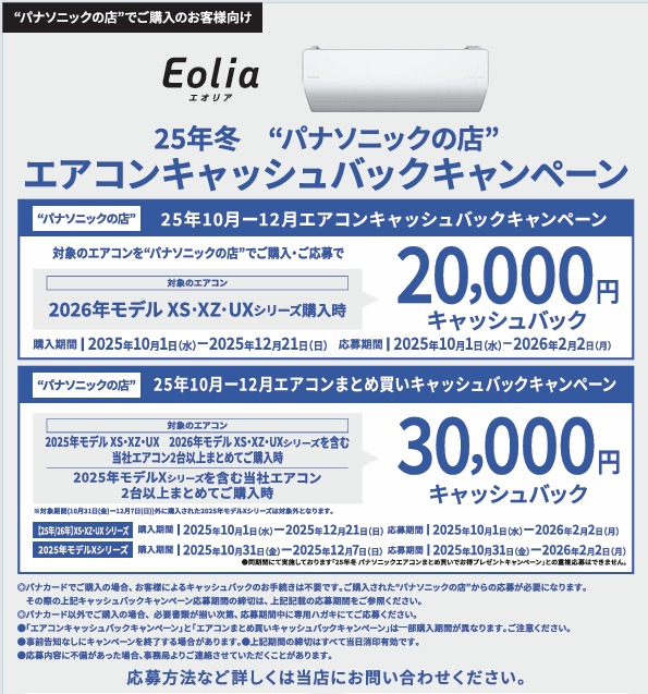 💰エアコン メーカーキャッシュバックキャンペーン【パナソニック・エアコン・エオリア・家電・買い替え・取り替え・岡崎市・電気屋】