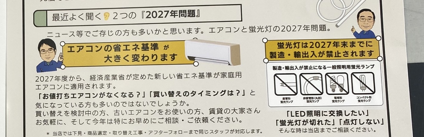 本日配布のチラシにもありましたが、2027年問題?とは??蛍光灯は2027末で一般照明用蛍光ランプの製造、輸出入が禁止になります